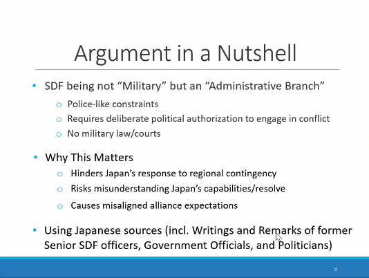 Yuji Idomoto (University of California San Diego) presented a paper on the legal constraints faced by Japan’s Self-Defense Force (SDF). While recent scholarship has focused on Japan’s defense buildup, Idomoto highlights the legal dimension which creates notable differences between the SDF and other militaries. First, Japan’s SDF is one step removed from typical combat readiness during peacetime because it operates under a positive list of authorized actions in response to immediate threats. Transitioning to a negative list used by most other militaries requires explicit cabinet approval through a Defense Operations Order. Second, Idomoto highlights the incompatible incentives faced by SDF personnel in the absence of a military court or legal framework to adjudicate misconduct and clarify individual liability for actions taken during military operations.